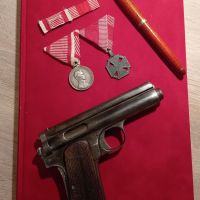 Egy kedves barátom jóvoltából jutottam a képen látható kitüntetéssorhoz. Egy fadobozban voltak elrakva a darabok, őrizgették őket. Érdekes, hogy előkerült még velük egy letört fülű kisezüst is. Manapság egyre ritkábban lehet találni ehhez hasonló darabokat, amik még nem kerültek ki kereskedőkhöz. Tudom, hogy nem a legszebb darabok, de nekem így kerek a történetük, számora így patinásan is szépek.