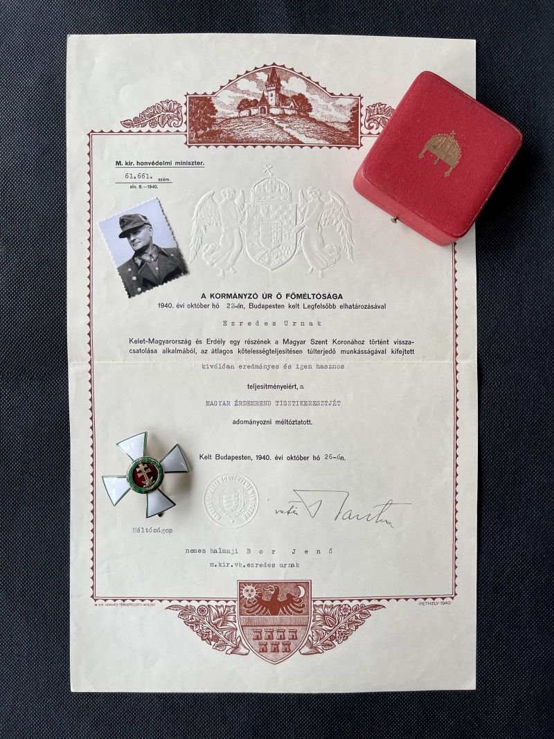 Erdély visszacsatolása alkalmából nemes halmai Bor Jenő ezredes (később altábornagy) részére adományozott Magyar Érdemrend tisztikeresztje adományozóval.