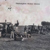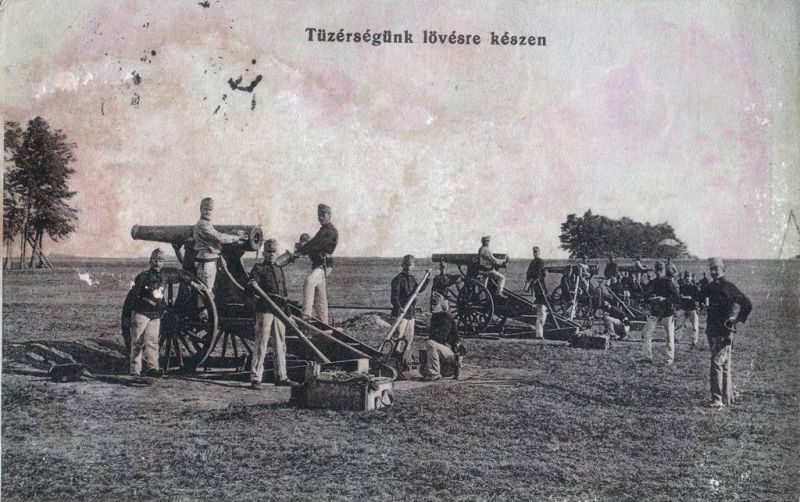 1894 M 15 cm-es nehéz tábori tarackok, erődlöveg-talpon, 1880 M hátrasiklásgátló szerkezettel felszerelve (ha jól azonosítottam őket)