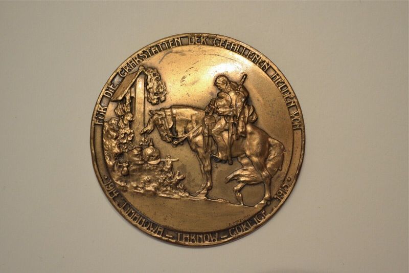 Az 1914-1915-ös nagy keleti csaták elesetteinek emlékére. Egy kicsit viharvert, de nagyon szép és kifejező. Egy oldalas, 60 mm-es érem, az éremművész F. Mazura. Felirata: