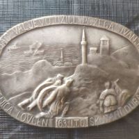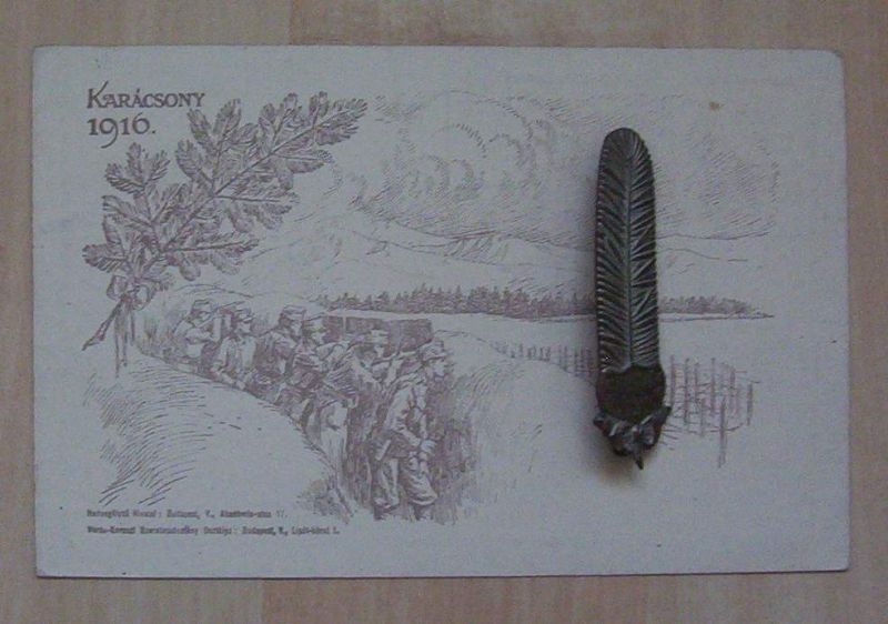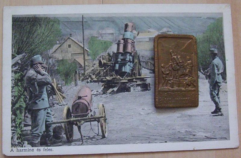 Ezt a plakettet most vettem, az alakja és a témája sem szokványos, egészen nagy egyébként (100mmx60mm). A balkáni frontról származó a jelenet, ágyú, hajó, minaret... Nagyon szép, de a rövidítéssel nem boldogulok, valamilyen tüzér alakulatnak állít emléket. Talán egy parti üteg? Nagy valószínűséggel sapkajelvény is lehetett belőle.