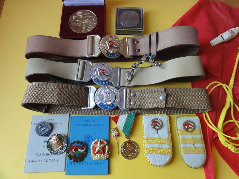 A képen pedagógus, kisdobos és úttörő emlékek láthatók