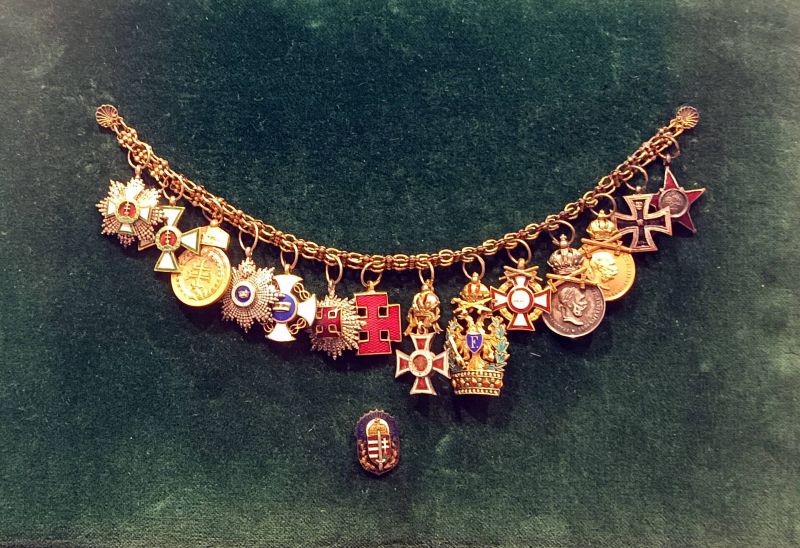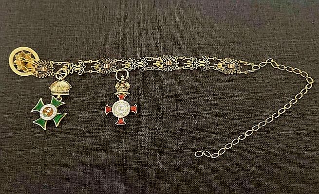 Múlt évben került hozzám ez az érdekes frakklánc egyik piacozás közben. A frakklánc a Ferenc József-rend nagykeresztjéhez tartozik. Erre két miniatűrt helyeztek, melyek az elhelyezkedés miatt a Szent István-rend középkeresztje és a Koronás Arany érdemkereszt. Lehet, hogy több darab is volt a láncon, lehet, hogy előrébb került, de így került hozzám.