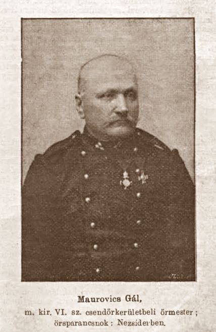 Maurovics Gál csendőrőrmester fotója a Csendőr Zsebkönyv 1896. évi számából. Amiért felteszem, az egy rendhagyó kitüntetés-adományozás, ugyanis leszerelésekor Arany Érdemkereszttel tüntették ki.