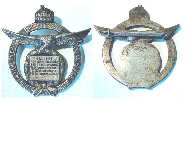 A dilemma: lehet hogy belefutottam egy másolatba? Vagy csak egy másik veretről van szó? A baloldali jelvény elméletileg ezüst alapú. A hátlapon ahol a ütközetek helyszínei vannak sorolva   eltérés van: a jobb oldalin nem Galicia alatt szerepel 1-2 helyszín megnevezésénél hanem a Kárpátok. A két darab mérete kb. azonos de a kialakítása különböző, a bőr felfüggesztő szíj bujtató része más méretű,  a karakterek -  és a szöveget lezáró jel szintén más, az előlapon a honvéd ábrázolása elnagyolt, nincs kézen fogható kontúr stb.