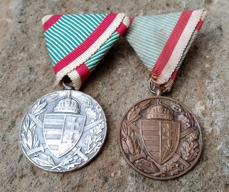A képen látható kettő Magyar Ezüst Érdemérem "A" beütős bécsi változatai láthatók. A fémjel a fül mellett jobbra, a másik éremnél balra található.