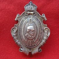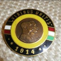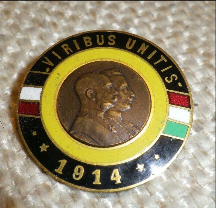 A német, a Habsburg és magyar színek, a két uralkodó, az évszám és a jelmondat, jellegzetes patriotika jelvény az első világháború elejéről.