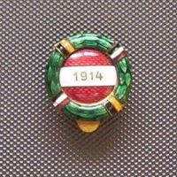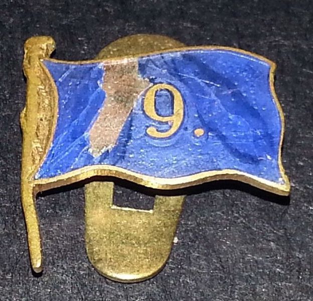 Most vettem ezt a - sajnos sérült - kék zászlócskát. Az eladó a 9. cs.és kir. gyalogezred jelvényeként árulta, de az zöld volt. Szerintem a m.kir. 9. gyalogezred gomblyuk jelvénye, talán a mérete miatt ezekre nem rakták fel a címert és az MHKGYE betűket. Jól gondolom? Az fel sem merül, hogy hamis, lásd hátoldali képet.
