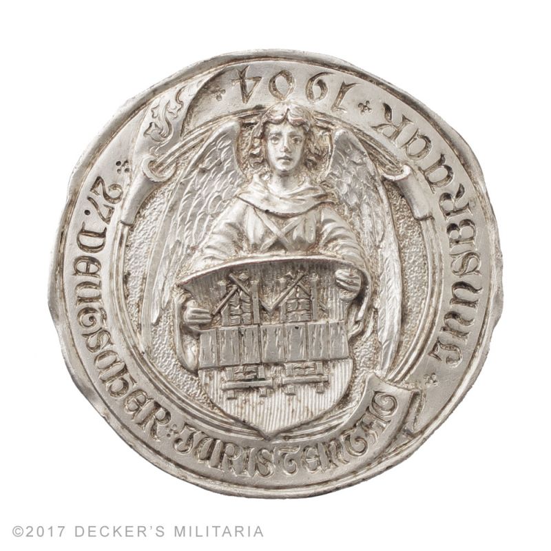 A jelvény ezüstözöttnek tűnik, felirata: "27. Deutscher Juristentag - Innsbruck 1904", az angyalka a város címerét fogja a kezében. A gyártója egy bizonyos müncheni illetőségű Gustav Deschler.