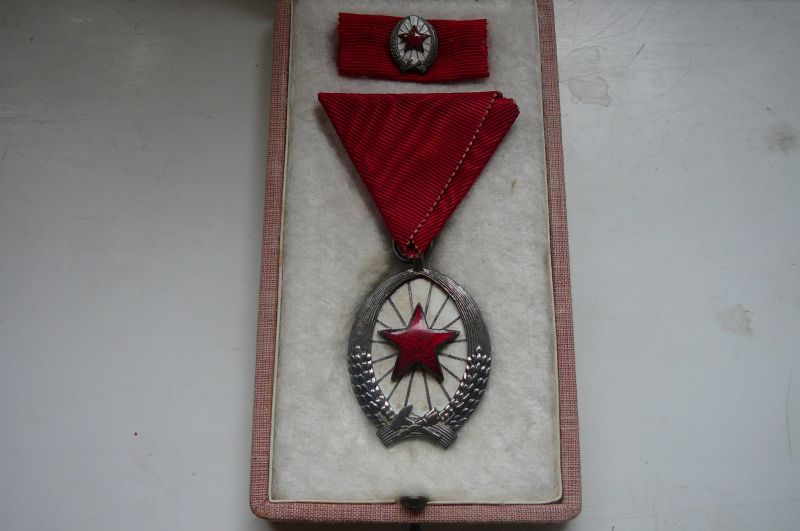 Az MNK Érdemrend III. fokozata (1949) dobozában. Gyártójellel ellátott, nagyon szép szett. A III. fokozat doboza teljesen megegyezik a II. fokozat dobozával, a kitüntetések mérete teljesen azonos.