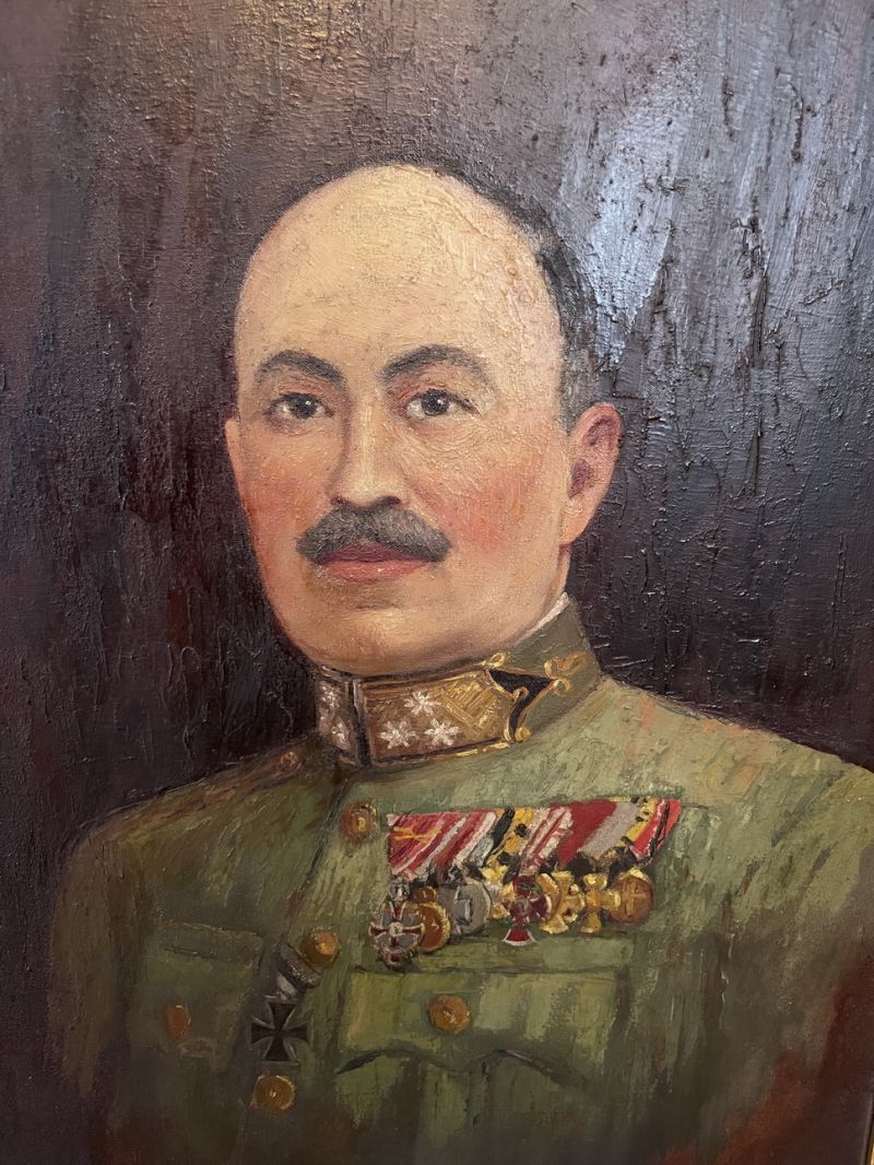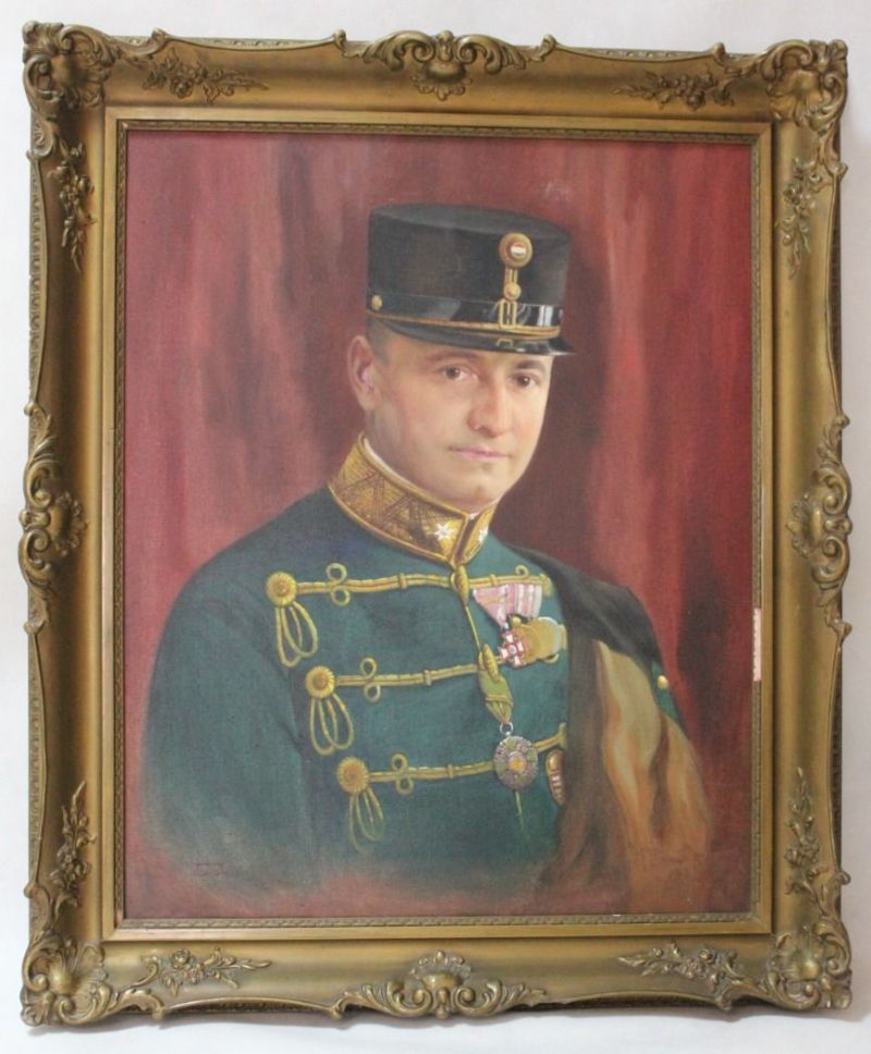 Ami számomra is kiderül; hivatásos gyalogos főhadnagy, akit nem sokkal a háború előtt avathattak tisztté, de már fiatalon felhívhatta magára a figyelmet, erre utal a katonai szalagos Signumja. A hadiszalagos, kardos Signumja mellett II. o. Vaskeresztje és német Sas rendje is van. A német kitüntetései egyikét talán a hadiszalagos, kardos Signummal együtt érdemelhette ki, ugyanazzal a fegyverténnyel, de ez egyáltalán nem biztos. A festő osztrák, ami talán arra utal, hogy a háború végén nyugatra került, elképzelhető, hogy maga a kép már emigrációban készült.