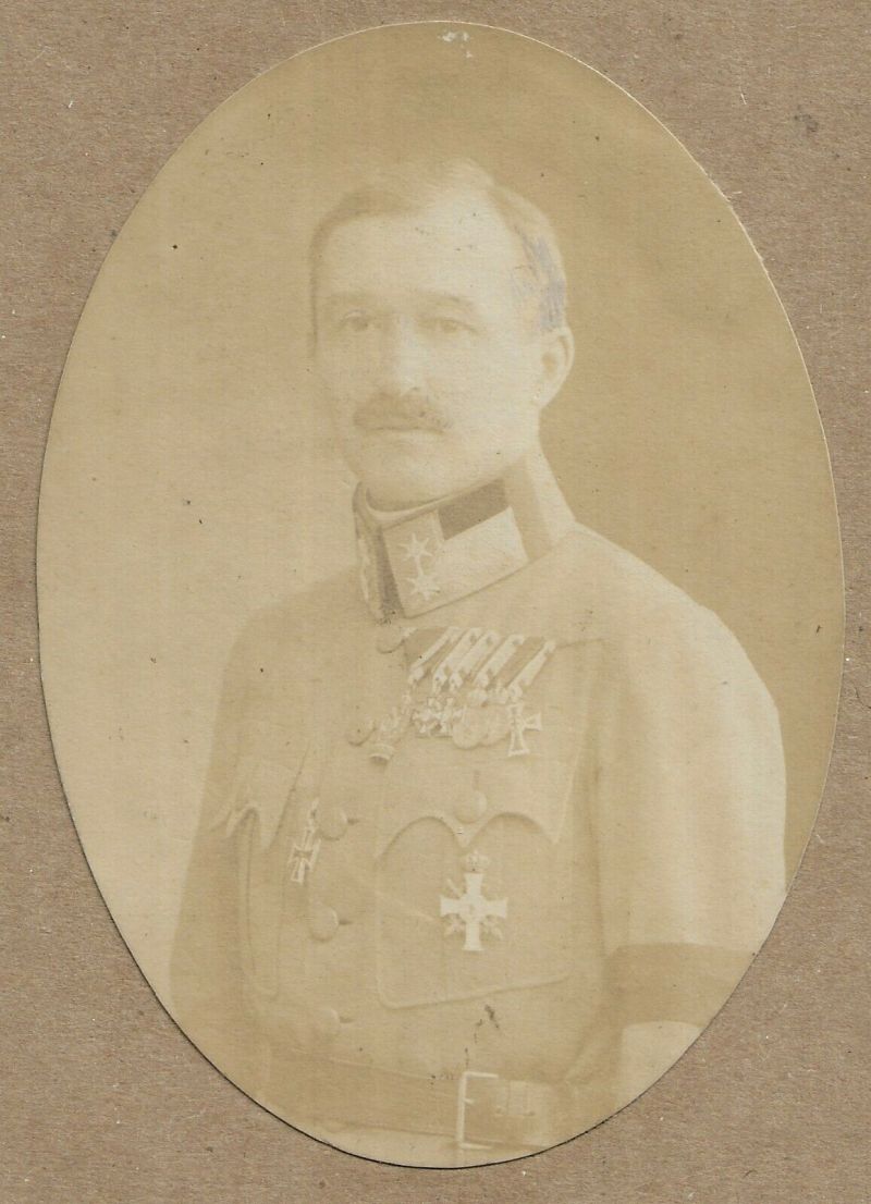 Most láttam az ismert külföldi árverési oldalon, kikiáltási ára 9 EUR. Leginkább az 1919-es bankgassei puccs szervezőjeként ismeretes, tiszttársaival elfogták a Kommün bécsi képviselőit, de az osztrák kormány őt tartóztatta le (Khmmm...) illetve ő volt az Országos Frontharcos Szövetség elnöke. Szépen dekorált tiszt, az első világháborús fotón ha jól látom a szász Albrecht rend kardos tisztikeresztjét is viseli.