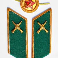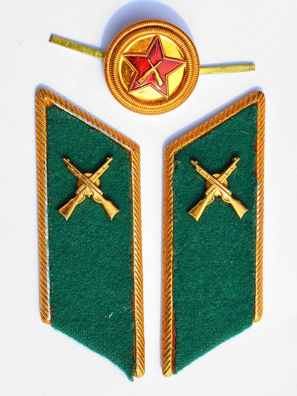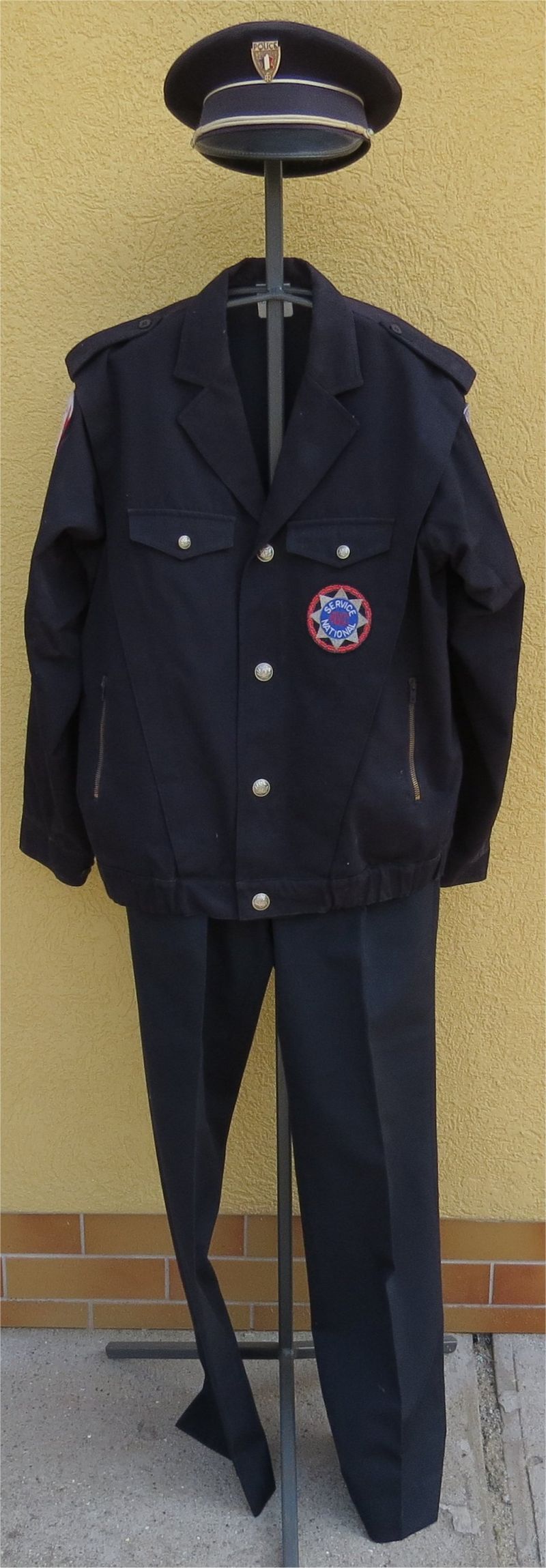 Fésűsszövetből készült igényes, szuperslankított darab, az ujjakon és a nadrág (a képen nem látható, de megvan) oldalán vörös szegélyezéssel. A bőr szemernyős sapka ugyanezeket a színeket viseli magán. A zubbony vállán a szovjet ihletésű váll-lapokon a három csillag felett igazságügyi fegyvernemi jelzés (pajzs alapon kard és mérleg) látható.