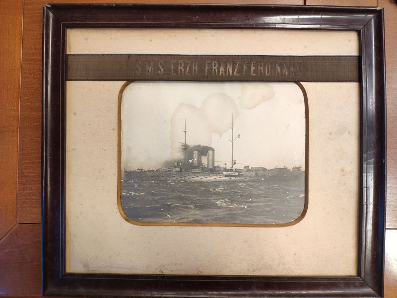 Az SMS Erzh. Franz Ferdinand osztrák-magyar hadihajó bekeretezett fotója (kerettel együtt 43 × 37cm), amelynek különlegessége, a képpel együtt bekeretezett eredeti matrózsapkához való szalag.