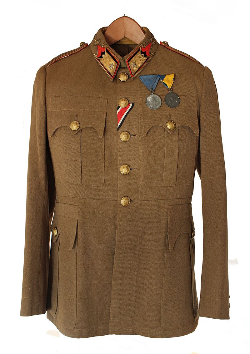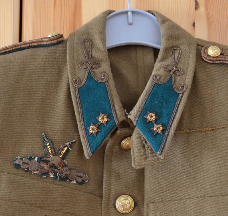 Magas, de nagyon vékony műszaki tisztviselő alezredes (meggyvörös posztó hajtóka és paszpolozás) köpenye. Az stráfok nincsenek a köpenyen, de a helyük halványan látszik, a szélességből lehet következtetni arra, hogy két sáv lehetett ott..