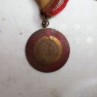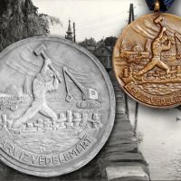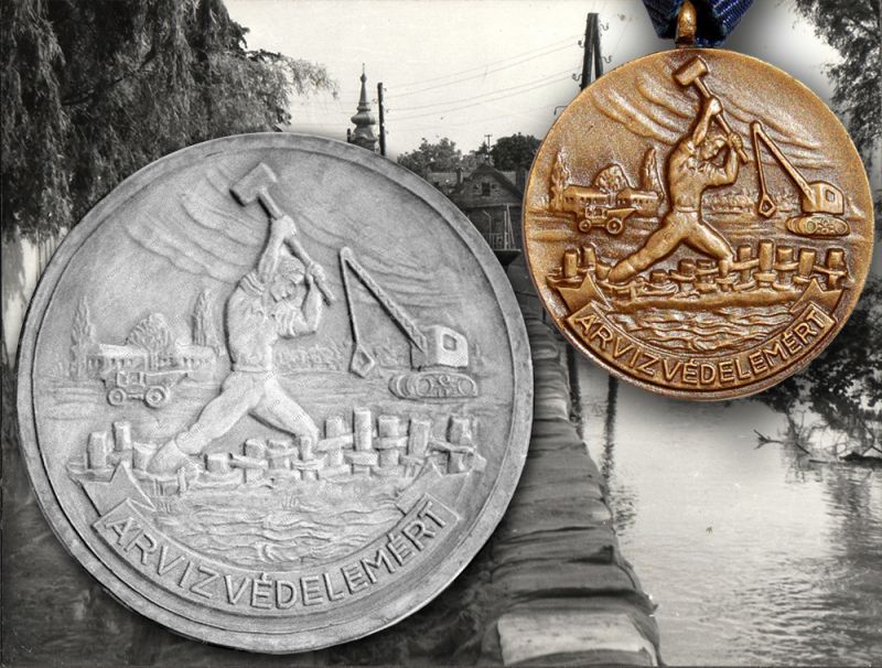 Az 1965 tavaszán bekövetkezett árvíz (a háttérkép Pócsmegyert mutatja az árvíz idején) során, az árvízvédelmi munkákban aktívan részt vettek elismerésére új emlékérmet alapítottak, amelynek modelljét 1965. május 9-én mutatták be. Mellette a megvalósult kitüntetés előlapja.