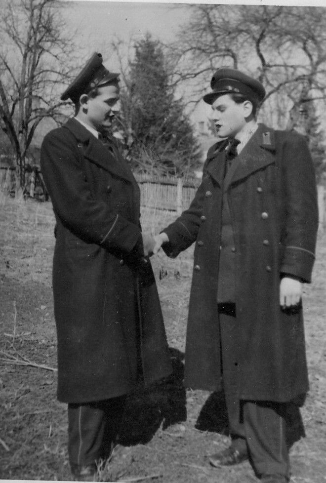 A gyenge minőségben, utólag színezett kép 1953 körül készült, a két férfi bányászegyenruhát visel.