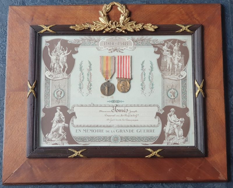 Az egykori tulajdonosa Caporal (tizedes) Joseph Jomés a 80. gyalogezred állományában harcolta végig a Nagy Háborút. Az ezred 1916-17-ig Verdun-nél küzdött. Az emléklap egy nagyon szép Art Deco stílusú (ha jól tudom) keretben érkezett.