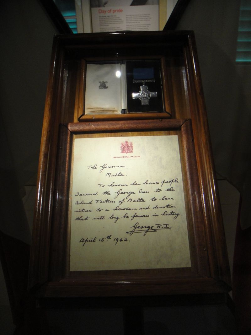 A Máltai II. Világháborús Múzeumban kiállított György-kereszt, melyet a sziget a zászlajába is beemelt.