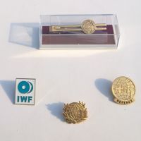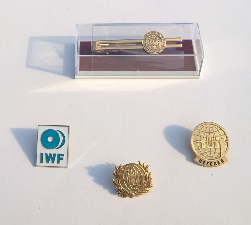 A Nemzetközi Súlyemelő Szövetség (IWF) 1905-ben alakult és ez a súlyemelősport irányító testülete. A Szövetség magyar elnökétől kaptam az alábbi jelvényeket, amelyet a tagok viselnek a különböző sportrendezvényeken, versenyeken.