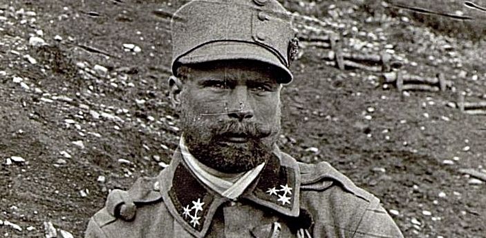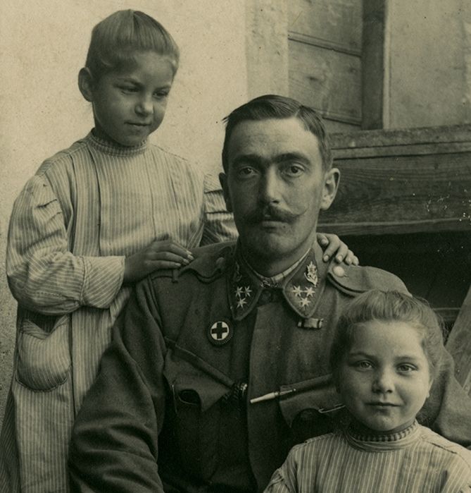 A képen Wildalpenből származó stájer Franz Schnehsl látható, az általa megmentett két dél-tiroli gyermekkel, az olasz fronton valahol .