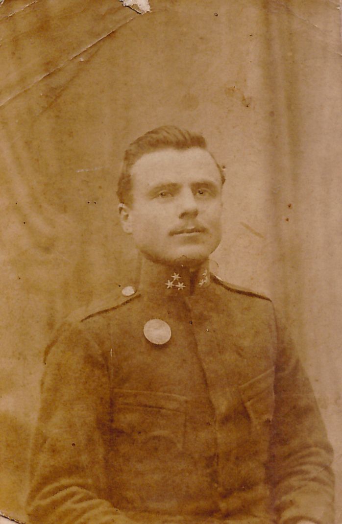 I. Világháborús patrióta jelvény (kereszt) viselve.