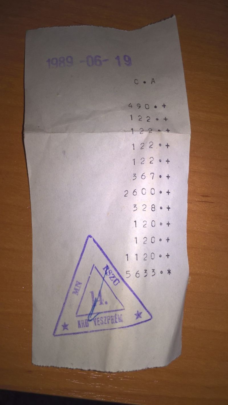Tegnap került hozzám néhány MN ruhadarab, egy nyugdíjas katonatiszt jóvoltából. Az egyik kabát zsebében találtam ezt a pénztárgép blokkot.