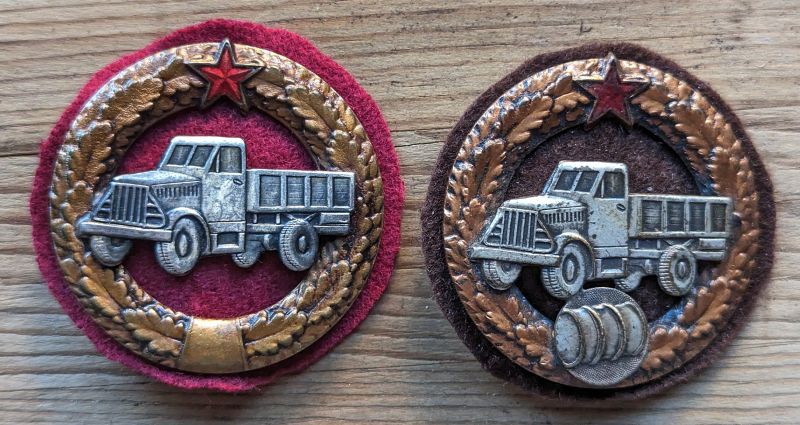 KIváló Gépkocsivezető és Üzemanyagos, kétfajta színű (gépkocsizó, hadtáp) posztóalátéten. Más fegyvernemeknél is kaphattak ezekből a jelvényekből, pl. gyalogságnál, páncélosoknál stb., az ennek megfelelő színű posztóalátéttel?