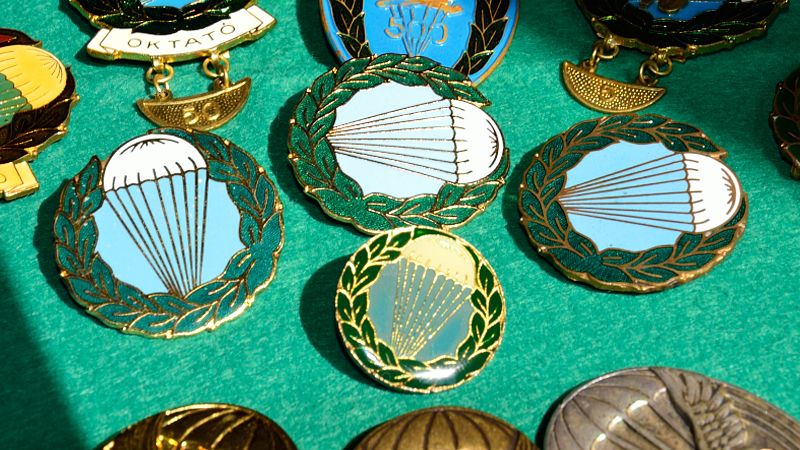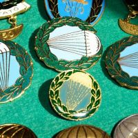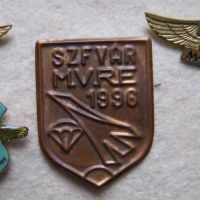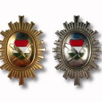 Végzettségi jelvények (egyetemi, ill. főiskolai). Ismereteim szerint mindkettőből létezik zománcos és műgyantás típus is, ezek az utóbbiak.