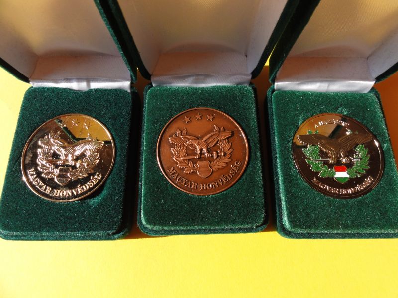 Fém lemez fa talapzaton az alján zöld illetve fehér posztóval.MN 6025(1.Honi légvédelmi hadsereg parancsnokság Budapest), MN 5313(1.honi légvédelmi hadosztály parancsnokság Veszprém).