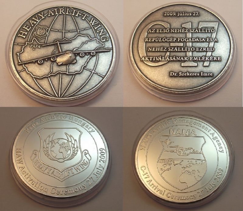 Érméket nem gyűjtök ugyan, de a repülős témájú relikviák, különösen a pápaiak érdekelnek. Legújabb szerzeményem két emlékérem, melyet az első szállítógép megérkezésére, illetve a Nehéz Szállító Ezred (Heavy Airlift Wing, HAW) aktiválásának emlékére készítettek.