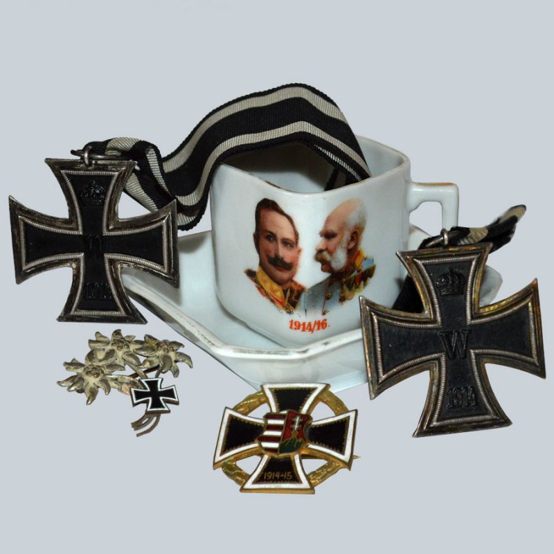 A porosz- és a háromszög-szalagos II. osztályú Vaskereszt, egy német és egy monarchiabeli hazafias jelvénnyel, melyeken a vaskereszt, mint motívum szerepel. középen egy korabeli patriota kávéscsésze alátéttel.