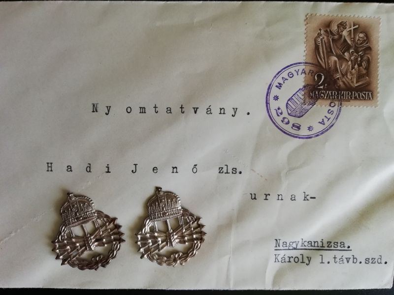 Híradó/távírász fegyvernemi jelvények párban, zászlós úrnak címzett boríték, Nagykanizsa Károly laktanya távbeszélő század. Saját gyűjteményi darabok. A pecsétet még nem sikerült megfejteni, ha megtalálom leírom a feladó helyet.