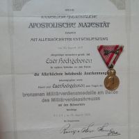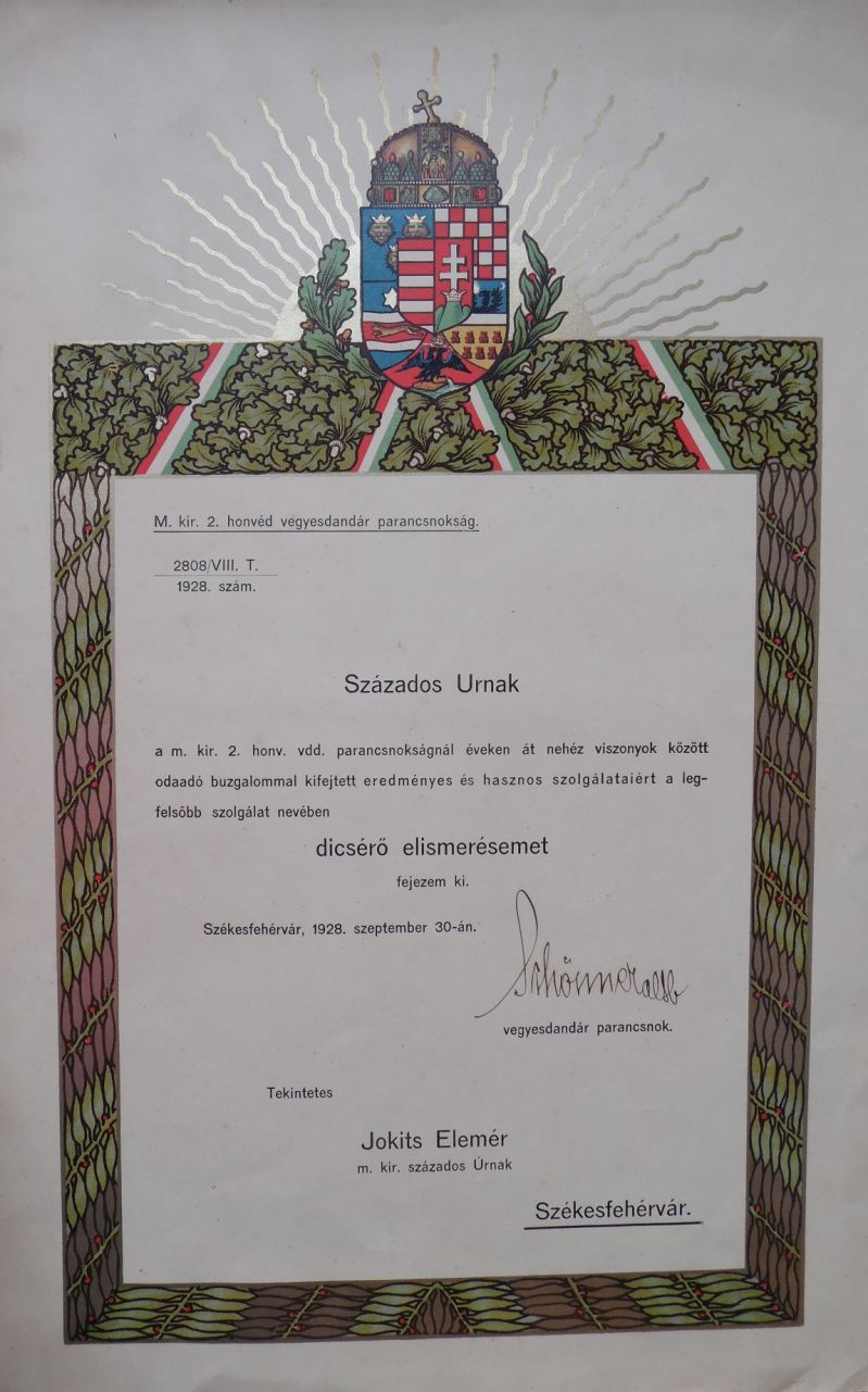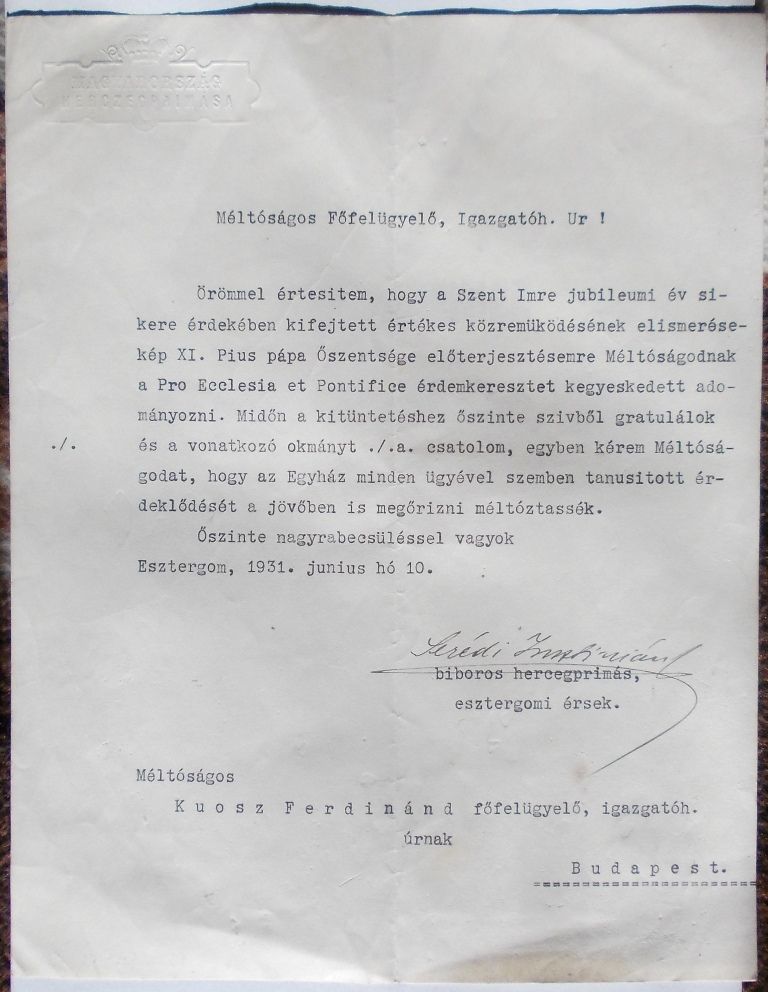 A sok katonai kitüntetés mellett egy civil/egyházi érdekesség, Magyarország hercegprímásának dombornyomott fejléces papírján és sk. aláírásával.