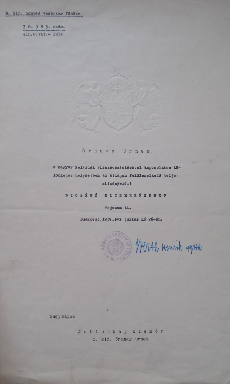 A Felvidék visszacsatolásával kapcsolatban kapta a kitüntetett.