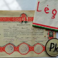 A bizonyítványt Szegeden állították ki 1941-ben, 3 különböző pecsét is van az iraton. Jelvény, karszalag mellette.