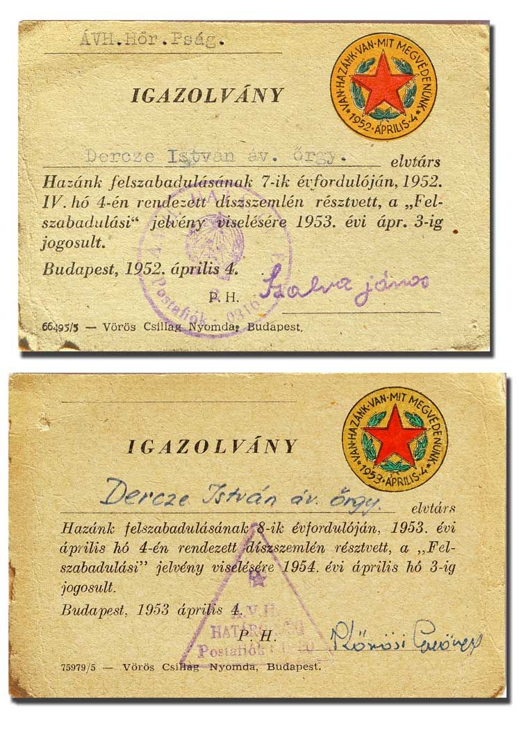 Az igazolványok (adományozók) tulajdonosa, egy ÁVH határőr ("zöld ávós") őrnagy, 1952-ben és 1953-ban részt vett a díszszemléken. A jelvények egy éven át - a következő díszszemléig - voltak viselhetők, mint olvasható.