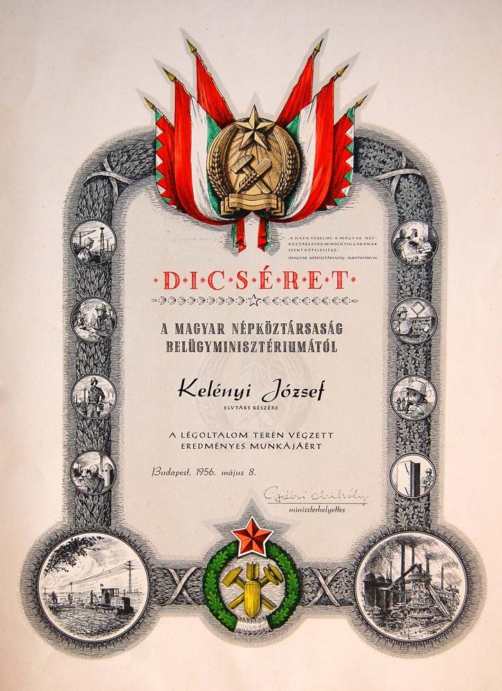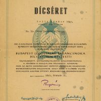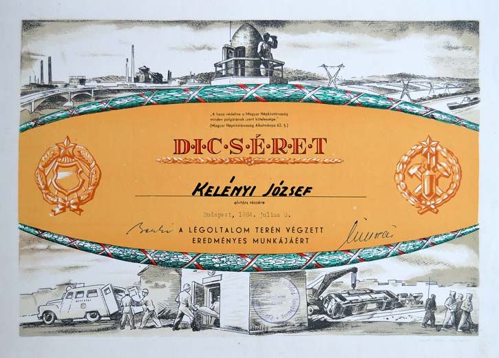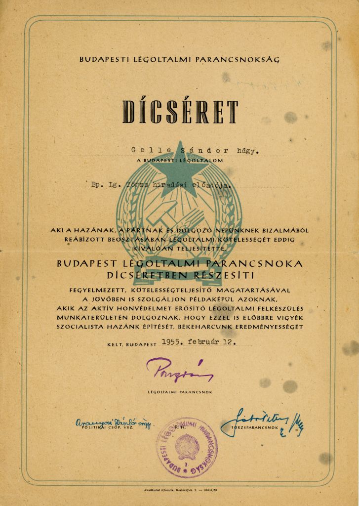 Egy viszonylag kevésbé ismert terület, a légoltalom. Nem rég hozzám került egy dicséretről szóló "oklevél", melyet Budapest Légoltalmi Parancsnoka írt alá, 1955-ben.