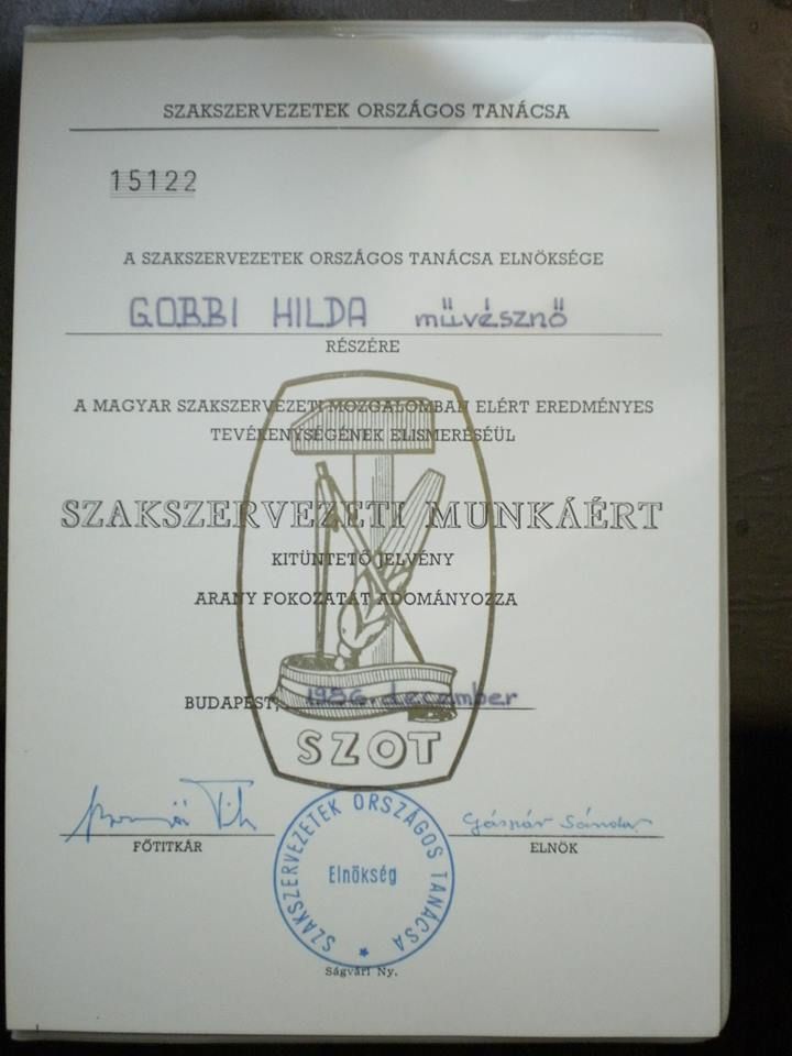 Szakszervezeti munkáért kitüntetés adományozó Gobbi Hilda művésznő részére