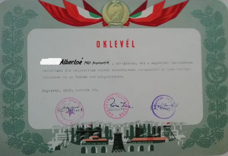 Oklevél az 1950-es évekből meo fonalszakító részére.