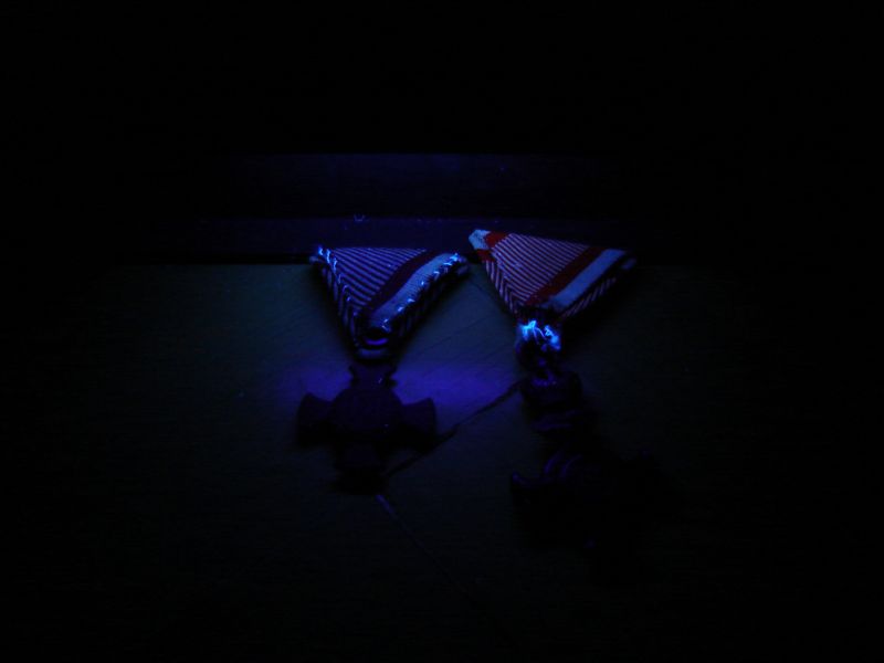 A fenti kitüntetéseknél számomra gyanús a Vas Érdemkereszt szalagja ( a szövés miatt ), viszont az UV nem ezt mutatja.