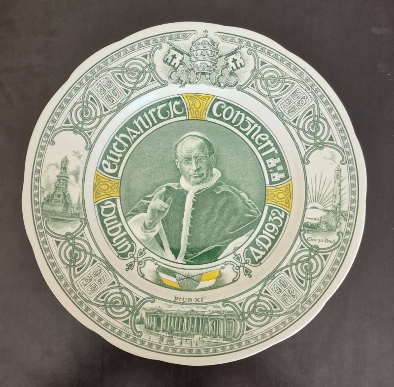 Az elefántcsont színű porcelán tányér közepén XI. Piusz pápa (1922-1939) portéja és a „Kr. u. 1932. évi Dublini Eucharisztikus Kongresszus” körfelirat látható, melyet az ír és a vatikáni zászló zár össze.