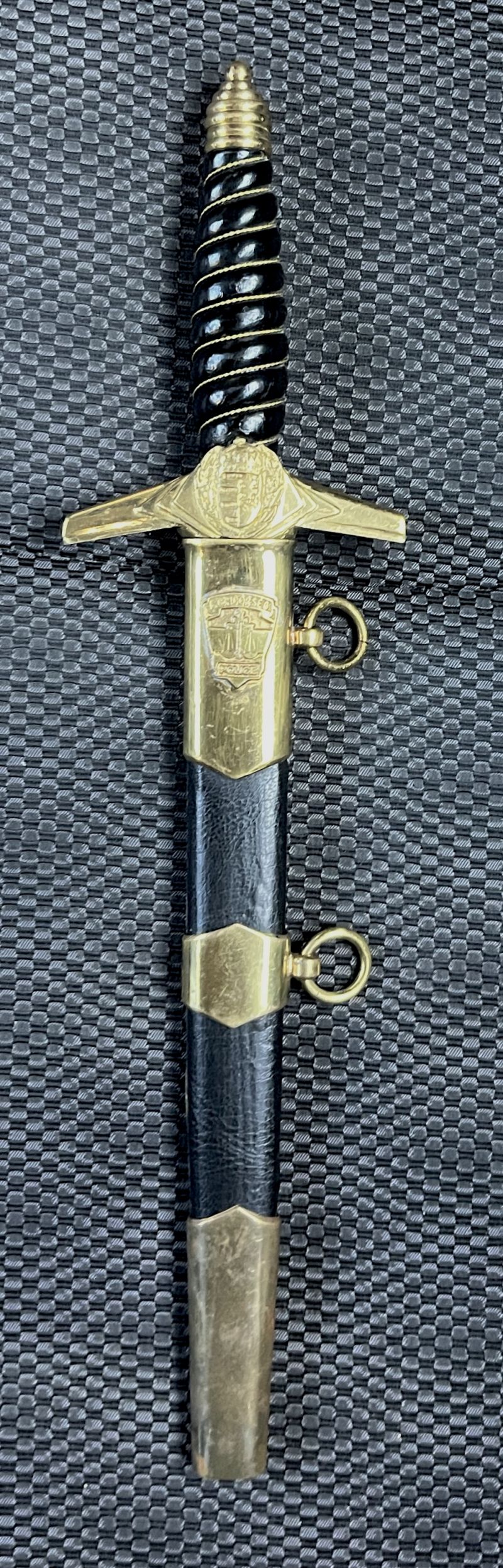 Egy munkatársamtól kaptam ajándékba, alacsony sorszámú. Siófokról került hozzám. A pengét nem kímélte az idő, de akadás nélkül visszamegy a hüvelyébe. Sajnos a csatlék nem került elő.