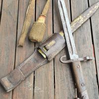 Szép állapotban lévő célzótüskés bajonett. Megmaradt az eredeti tábori zöld festés a tokon, továbbá eredeti papucs és bojt. Kredenclelet.