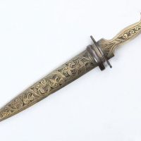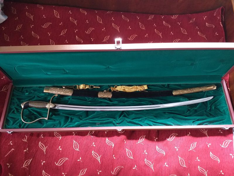 A honvédelmi miniszter, Kárpáti Ferenc ajándéka volt ez a kard nagyapám számára a 70-ik születésnapja alkalmából, 1986. január 22-ikén. Gyönyörű zöld bársonybetétes dobozban, díszhüvelyben.