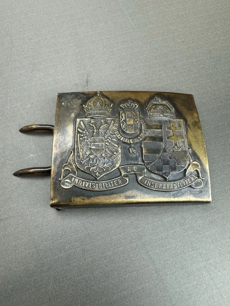 Én eddig csak olyan övcsatokkal találkoztam, amin a birodalmi kétfejű sas volt látható. Honvédeknél a magyar címer. Úgy tudom, hogy a kettős (hármas) címert hivatalos használatra 1915 végén vezették be. Lett volna bőven idő megfelelő övcsatokat is gyártani. Mégis, egészen mostanáig nem láttam ezt a csatot. Fotókon is mindig a sasos csat látszik.