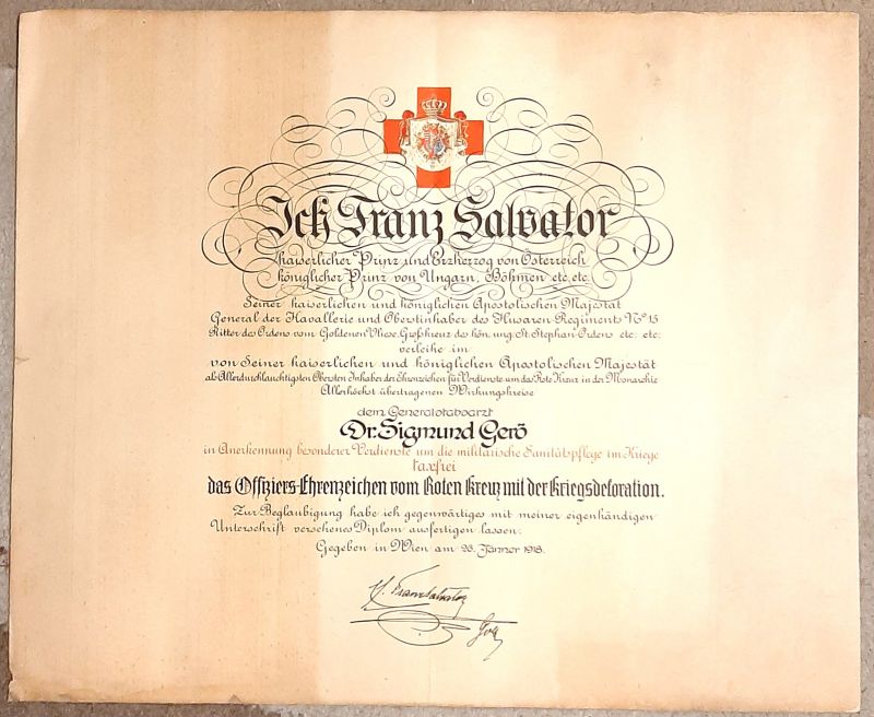 Egy ritkább adományozó a Vöröskereszt Tiszti díszjelvényének adományozó okmánya 1918-ból.