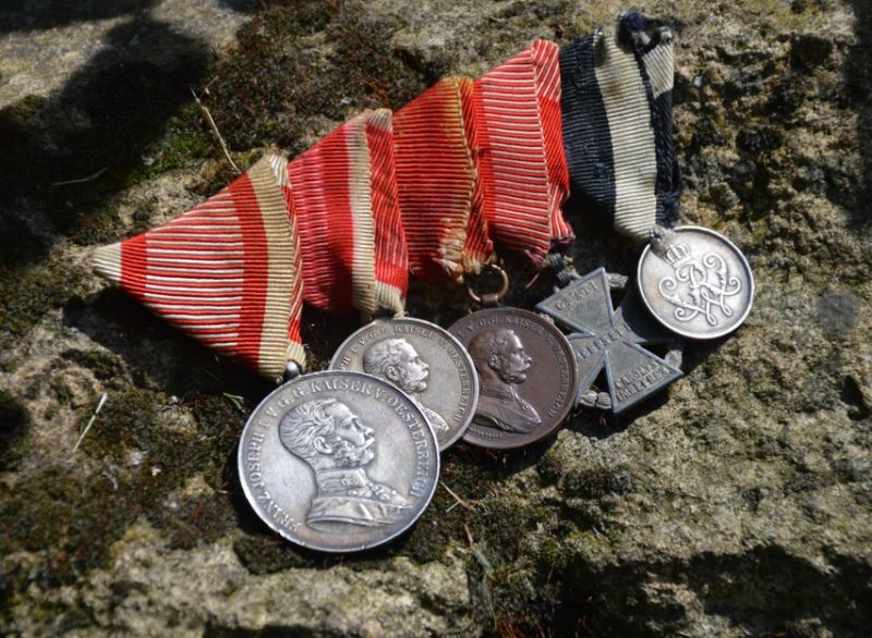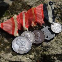 Egy kedves barátom jóvoltából jutottam a képen látható kitüntetéssorhoz. Egy fadobozban voltak elrakva a darabok, őrizgették őket. Érdekes, hogy előkerült még velük egy letört fülű kisezüst is. Manapság egyre ritkábban lehet találni ehhez hasonló darabokat, amik még nem kerültek ki kereskedőkhöz. Tudom, hogy nem a legszebb darabok, de nekem így kerek a történetük, számora így patinásan is szépek.