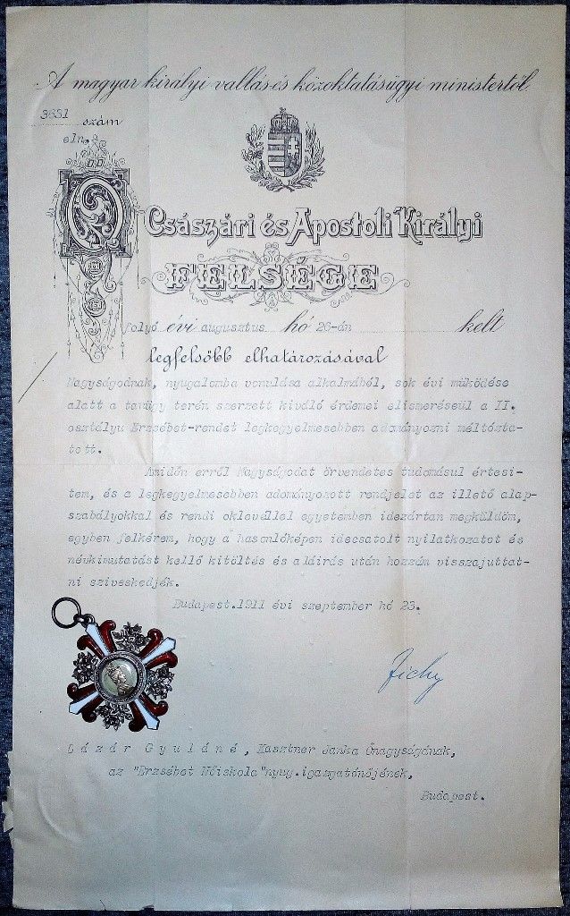 Gróf Zichy János vallás- és közoktatásügyi miniszter aláírásával.