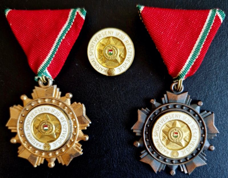 Számomra érdekes leletre bukkantam a hétvégén az egyik piacon, egy "filléres tömegjelvény" kitüntetés változataival. Az eladó elmondása szerint honvédségi forrásból származnak. A kérdés az, hogy ez egy egyedi kreálmány, vagy esetleg többször is ilyen kitüntetésekkel - jelen esetben arany és bronz -jutalmazták a sportversenyek helyezettjeit.